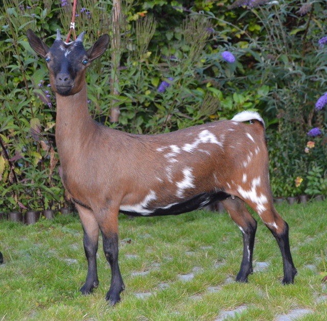 Was ik al bijna vergeten over de ‘X-factor’ te hebben. Vorige week sprak ik al met Pieter Sibma en ik had Valeriaan van de Optimist dit voorjaar al eens gezien en echt een aparte bok. Volgens Pieter was dit nog zo en alhoewel hij niet foutloos is, is dit een bok met de ‘X-factor’ zei hij. We zijn toch altijd op zoek naar iets ‘aparts’ waar geen storende fouten aan zitten. Toen hij me nog een foto van hem liet zien, wist ik het eigenlijk al. Dit wilde ik wel een keer proberen. Eerst maar even weer in het echt zien op de bokkenkeuring werd afgesproken. Ik stond toevallig ook nog met Joshua bij Valeriaan in de rubriek en had het maar druk met en zelf lopen en kijken hoe Valeriaan het deed. In eerste instantie was het nog even aftasten voor hem en zijn voorbrenger (duidelijk samen te weinig geoefend), maar hoe meer hij liep, hoe beter hij weer werd en daar zagen we de X-factor! Op de mooie momenten die al meer kwamen heeft hij een heel aansprekend en charmant type en het ras druipt er dan vanaf (vind ik). Dit werd tijdens de dag ook alsmaar duidelijker, met uiteindelijk de beloning van het dagkampioenschap van de lammetjes voor hem. Gisteren heb ik hem opgehaald en er mogen nu 6 geiten door hem gedekt worden en Junica stond al een dag op hem te wachten en haar geduld werd beloond (nou ja geduld, ze schreeuwde alles bij elkaar). Die was gelukkig nog goed rits en als alles nu goed gaat komen er in januari veel lammetjes hier. Hierbij nog de foto van Valeriaan die Pieter afgelopen zaterdag nog bij thuiskomst gemaakt heeft, kijk zelf maar en vooral de brutale zwarte kop spreekt meteen al erg aan. Ook zijn beharing is super mooi en mooi kleurtje en dan te weten dat de bok de hele zomer met een stel andere bokken (van aantal sterk variërend en nu waren ze met hun zessen volgens mij) in een grote kapschuur op het weiland zich maar moesten redden en ALTIJD over bijna alle hectares in de omgeving daar konden lopen en dat ook deden en zelfs tijdens regen… Dat te weten maakt de bok nog aparter (en geen hooi alleen maar wat brokjes om ze nog mak te houden!).