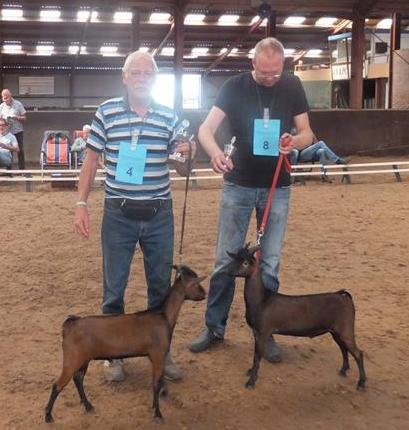 De jeugdgeiten Suzanne en Julene deden het ook geweldig. Suzanne 1A en Julene 1B en later bleek dat achter de kampioen. Voor het kampioenschap werden vier dieren naar binnen gehaald en bij die vier zaten Suzanne en Julene. Op dat moment als ze dan beiden buiten de boot vallen voelt het bijna als een lichte teleurstelling. Maar het is juist mooi om te weten dat je dieren zo goed mee doen. Hier de foto van de kampioensrubriek van de jeugdgeiten en ikzelf heb Suzanne beet (moeder van Joshelyn) en Agaath Plomp helpt me mee met Julene.