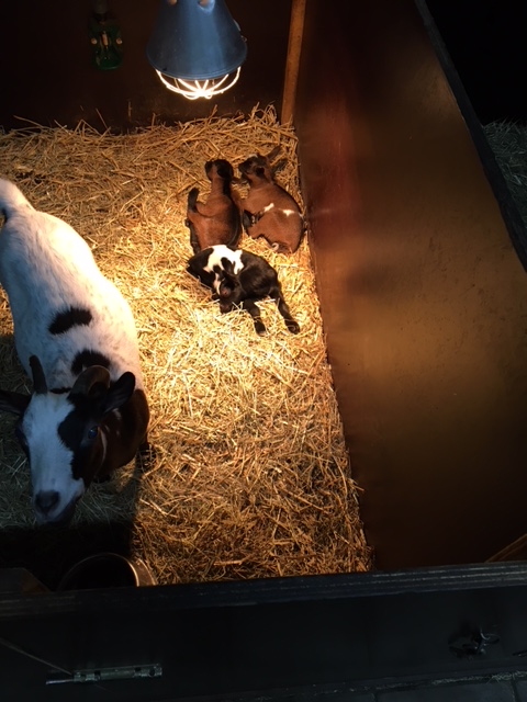 Op advies van Pieter Sibma is Klaas van der Ploeg nu al een kistje(s) aan het maken en dan wil ik hier ook een kistje in het hok zetten dat de lammeren daar in kunnen kruipen. Dat geeft behalve meer warmte voor de lammeren ook meer rust voor de geit en ze gaan er bijna nooit allemaal tegelijk uit te drinken hoorde ik. De moeder kan ik wel goed op melk krijgen, dus lijkt mij een mooi avontuur en dan zal ik wel rond 8 weken er twee bokjes bij weg halen denk ik, maar zo ver is het nog niet. Hier even een foto van vier lammeren bij elkaar en de trotse moeder die rustig is, maar super goed op haar jongen past. Echt goede moedereigenschappen en kan me nu al niet meer voorstellen dat die samen in die buik gezeten hebben, echt voor een vierling dikke lammeren en bijna geen verschil in gewicht.